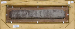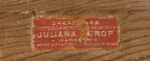 Na krośnie dwie nalepki warszawskiego Salonu Sztuki i Składu Farb i Przyborów Malarskich Juliana Burofa przy ul. Nowy Świat 47 (druk).