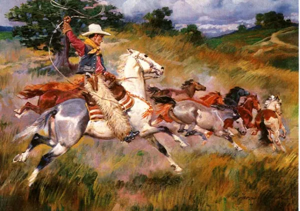 Chociaż Jerzy Kossak sam nigdy nie był w Ameryce, to jednak kilkakrotnie malował kowbojów pędzących stada galopujących koni. Wzorem dla niego były obrazy ojca, Wojciecha Kossaka, których kompozycję powtarzał z niewielkimi zmianami (porównaj: K. Olszański, Jerzy Kossak, Wrocław 1992, il. 166, 167; K. Olszański, Wojciech Kossak, Wrocław 1985, il. 233, 234).
