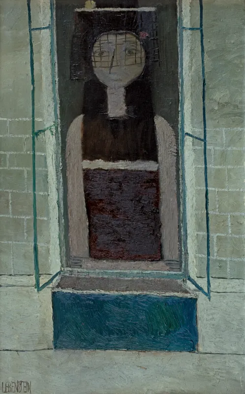Kobieta w oknie jest jedną z pierwszych prac Lebensteina o zupełnie nowej, innej wizji artystycznej, niż ta, którą artysta zadebiutował. Radykalna zmiana koncepcji nastąpiła w 1956 roku, gdy porzucił plener, a zafascynował się wnętrzem domów, z umieszczoną w nich centralnie sylwetką ludzką, a jednorodny, oparty na odmianach szarości kolor podkreślał ekspresję i dramaturgię dzieła. Obraz jest punktem wyjścia do następujących po sobie w latach 1956-1960 serii Figur we Wnętrzu, Figur Kreślonych czy Figur na Osi, gdzie Lebenstein przeprowadza swoistą metamorfozę postaci sukcesywnie eliminując jej indywidualne cechy.