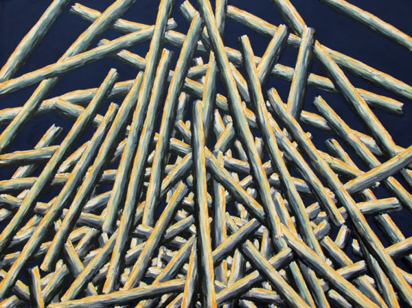 Na odwrocie na płótnie napis: (pionowa strzałka) | TOMASZ TATARCZYK | „STOS” 1987