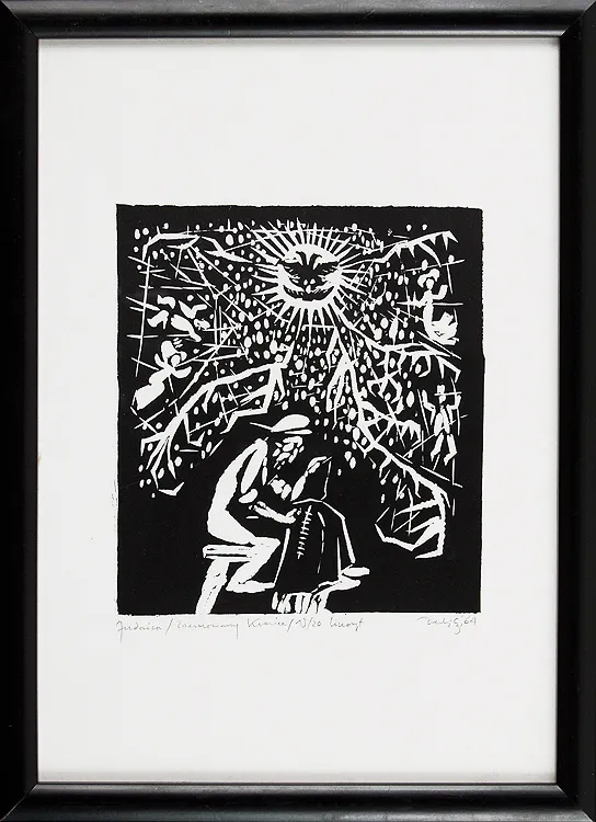 sygn. oł. pod ryc.: Judaica / Zaczarowany Krawiec / 13/20 linoryt, p.: Duda G.’64