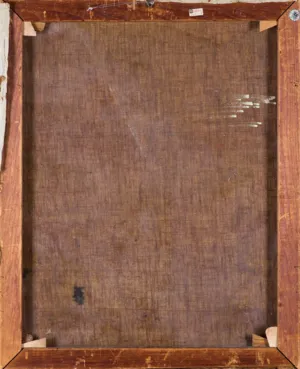 Na górnej listwie krosien malarskich dwie nalepki aukcyjne.