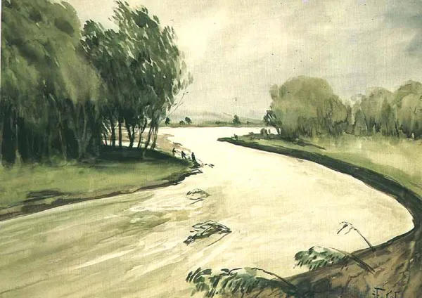 To samo zakole wezbranej powodzią rzeki górskiej malował Fałat kikakrotnie - bliską analogią jest obraz pt. "Wylew" malowany w 1925 r. (reprodukcja w "Sztukach Pięknych", R. II, 1925-1926, s.313).