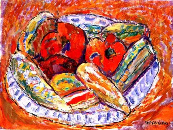 Sygnowany p. d.:WODYŃSKI Na odwrocie napis na płótnie: JAN WODYŃSKI/M.natura z pomidorami/ 50x65/ 1972