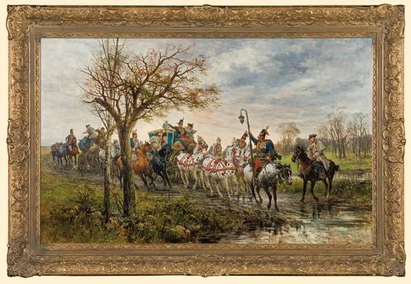 Jednak anonimowy autor opisu zamieszczonego w warszawskich „Kłosach“ temat obrazu określa - zgodnie z tytułem w berlińskim katalogu - jako „podróż możnego pana za czasów Augusta III“ pisząc następnie, że: „modne wówczas ubiory saskie przywdziewała służba [a] dwaj młodzieńcy obok karety jadący, mają na sobie staropolskie szaty, które nie uległy jeszcze wpływowi mody“. Autor, rozwodząc się nad przepychem życia osiemnastowiecznych magnatów, podkreślał też realizm przedstawionej sceny: „z dala widzimy furgon przeznaczony na bagaże i przybory kuchenne, na którym siedzi kilku służących, inni za nim jadą na koniach. Orszak poprzedza człowiek z latarnią, dając znak, iż jest bród do przebycia“.