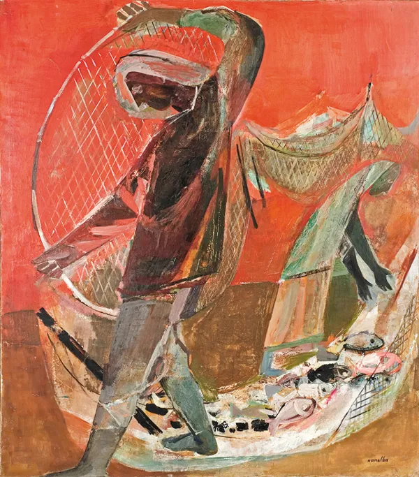 Na odwrocie napisy tuszem na płótnie: FISHERMEN | AT SUNSET | by | KANELBA | 1952