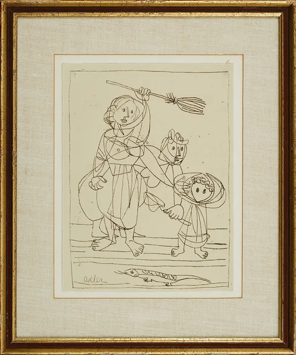 na odwrocie oprawy l.d. stempel z napisem w otoku: COLLECTORS GALLERY, śr.d. nalepka mpis: P.002 ADLER, JANKEL | „ORIGINAL ILLUSTRATION # 2” | (ink) | 10x7½, wyżej nalepiona kserograficzna odbitka strony z katalogu z reprodukcją innej monotypii Adlera