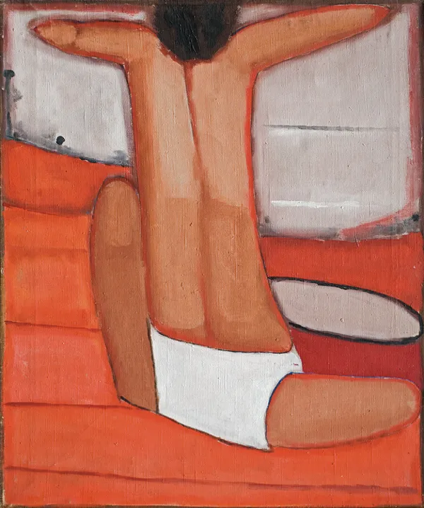 Na uszkodzonym papierze oklejającym górne krosno napis : WOMAN ON BE...NOWOSIELSKI
