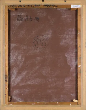 sygn. na odwr. na płótnie l.g.: Maria Anto 1994, poniżej: 1011 [w kółku], na g. listwie krosna: MARIA ANTO 1994 „ECO“ 100 x 77 cm, na l. krośnie pieczątka wywozowa