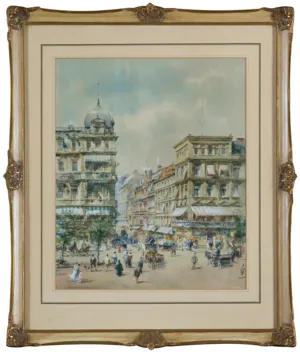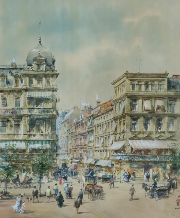 Obraz przedstawia ulicę Unter den Linden na rogu z Friedrichstraße. Z lewej strony są widoczne Cafe i Hotel Ba...