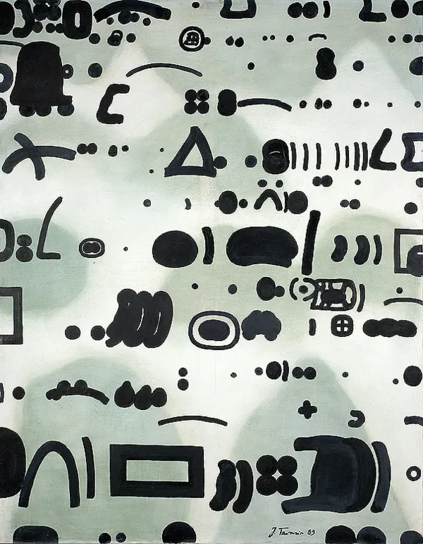 na odwrocie na płótnie p.g.: JAN TARASIN 89 | KOMPLIKACJA I 3 stemple zezwalające na wywóz za granicę, śr. nalepka: 36. | PSOZ - III - 645 / 98