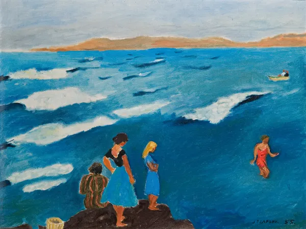 Na odwrocie płótna ślad okrągłego stempla. Na poprzeczce krosna nalepka wystawowa (druk, atrament) o treści: SOCIETE AUXILIARE DES EXSPOSITIONS DU PALAIS | DES BEAUX- ARTS | 10, rue Royale B Bruxelles | Exposition: Czapski | Title de l’oeuvre: Mer Bleue (36 | Collection: Madame Clermant Morrefe (?)