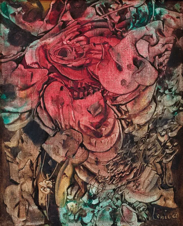 na odwrocie na płótnie mało czytelny napis ołówkiem: ALenica | Róża | czerwona | 1975