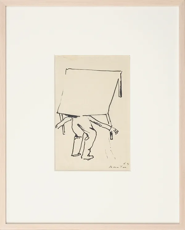 Na odwrocie nalepka mpis, wypełniona częściowo odręcznym pismem artysty: Tadeusz Kantor [obok sygn. tuszem:] TKantor | Cykl: "Człowiek i stół" | Rok: [ręcznie:] 1969 | Nr.: [ręcznie:] 12, niżej p. napis niebieskim dłg., częściowo zamazany: …c 1200 …