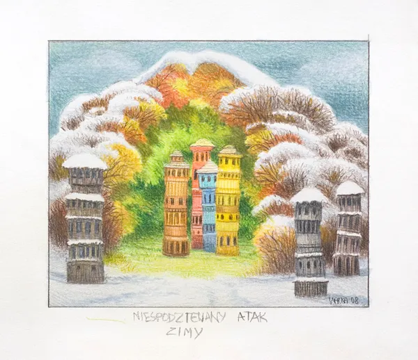 sygn.oł.p.d.: YERKA 08, niżej pod kadrem rys. NIESPODZIEWANY ATAK ZIMY