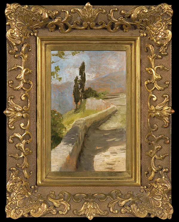 na odwr. 3 nalepki: - wystawy pośmiertnej Siemiradzkiego w TZSP w Warszawie 1903, - wystawowa TZSP z 1939, - rzymskiej ramiarni oraz fragment okrągłego, zielonego stempla rosyjskiego konsulatu w Rzymie (szczegółowy opis - www.agraart.pl)