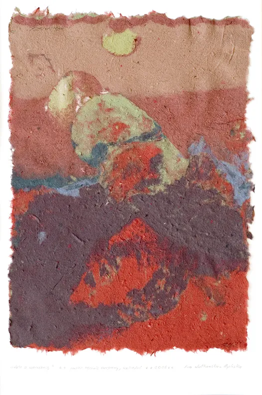 sygn. oł. na podkładzie od l.: “Lato z czerwienią” ** papier ręcznie czerpany, wschodni ** 2008 ** Ewa Latkowska-Żychska