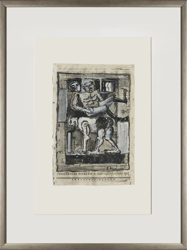 tusz, pędzel, gwasz, papier gazetowy zadrukowany