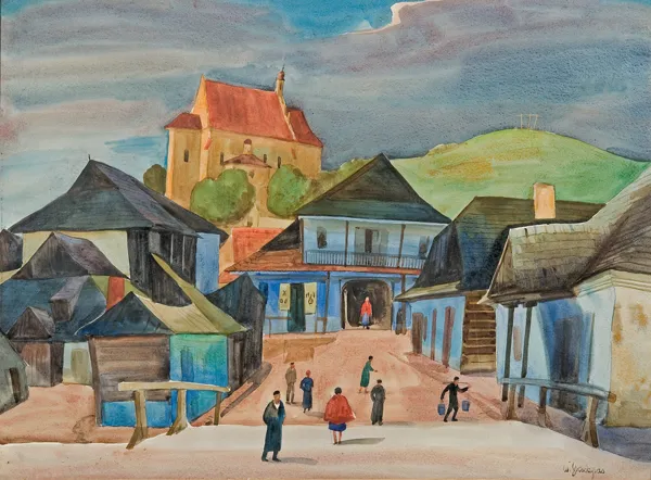 Prezentowana akwarela jest zapewne jedną z prac, określonych enigmatycznie jako Motywy z Kazimierza, zaprezentowanych w roku 1926 na wystawie Władysława Skoczylasa w warszawskim Domu Sztuki. Wśród wystawionych wówczas akwarel większość stanowiły widoki ulic, Rynku czy rodzajowych scenek z Kazimierza nad Wisłą. Autor katalogu podkreślając indywidualność i “sprawność ręki artysty“ zauważał także, że “Kazimierz nad Wisłą doczekał się wreszcie swego interpretatora“ który “z zaostrzonym wzrokiem na wyraz form, bierze, przetwarza i zespala najwyrazistsze elementy i kształty pejzażu“ ukazując “jego piękno swoiste w spiętrzeniu domostw, w głębokich perspektywach, w jarmarcznym zgiełku, w patosie skupionego światła słonecznego i szerokich cieniach“. Wystawa spotkała się z uznaniem krytyki i publiczności, co znalazło wyraz w ówczesnej prasie.
