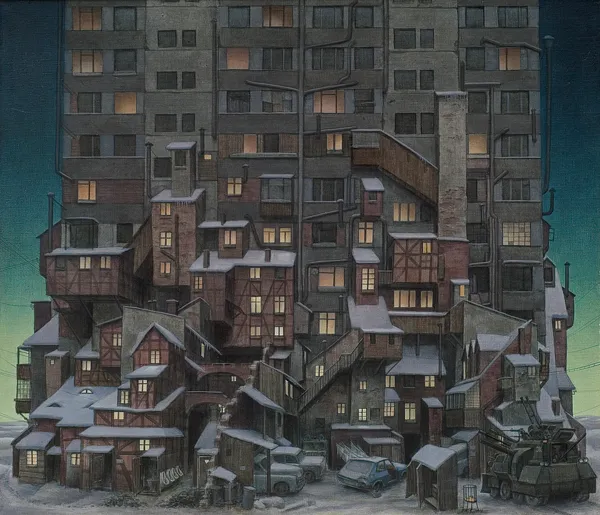 na odwr. na d. żerdzi blejtramu po prawej: JACEK KOWALSKI | [tekst zamazany] | „SPOKÓJ PANUJE W BLOKU“ | 1984 AKRYL