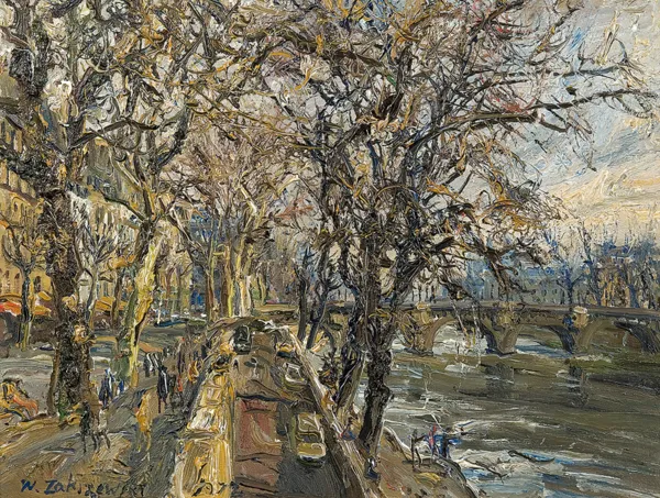 Na odwrocie autorski napis czarną farbą na płótnie: W. ZAKRZEWSKI | 1972 | PARIS | QUAI DE LOUVRE; niżej czerwona farbą: 46 x 61