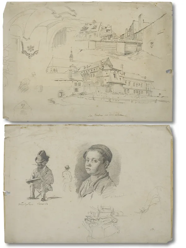 szkice głów kobiet w chustach oraz rysunki architektury Krakowa: - fragment kolebkowego sklepienia kościelnego; - zarys fasady kościoła; - stare zabudowania; - domy i kościół św. Katarzyny ujęte od strony północnej; ten szkic sygnowany ołówkiem p.d.: Wł. Czachórski; pod rysunkiem przy dolnej krawędzi karty napis atramentem, naniesiony inną ręką: Św. Barbara na Kazimierzu.