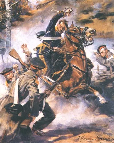Znany, wielokrotnie reprodukowany, malowany z rozmachem obraz, po raz pierwszy wystawiony wraz ze szkicami do panoramy "Berezyna" w warszawskim Salonie Aleksandra Krywulta w 1897 r.
