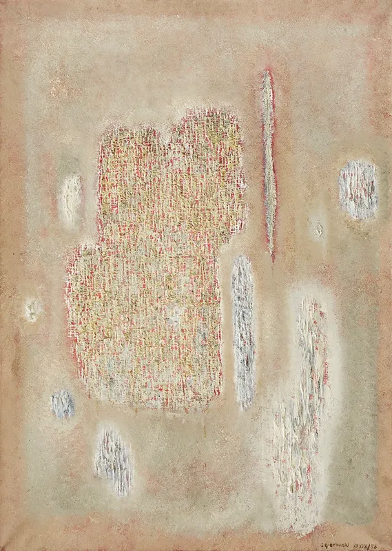 na blejtramie nalepki: - nalepka niemieckich zbiorów Sammlung Rosenkranz nr inw. 406; - Stefan Gierowski „Bild“ - o.50 x o.65 | Ol - 1958; ponadto na blejtramie napis: GIEROWSKI OBRAZ oraz okrągła pieczątka niemieckiego urzędu celnego.
