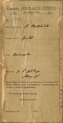 - tekst centralny: Kwesta „RATUJCIE DZIECI” | W WARSZAWIE | NO 331 | Nazwisko malarza St. Wyspiański | Rodzaj dzieła pastel | Tytuł Dziewczynka | Własność p. L. Goldberga | Marsz. 95 | Dzieło wyżej wymienione, a przeznaczone na wystawę pod | hasłem „Ratujcie dzieci”, otrzymaliśmy i obowiązujemy się zwrócić w stanie nieuszkodzonym | Przewodniczący Działu Wystawy [podpis wyblakły, nieczytelny] | Sekretarz Komitetu [podpis wyblakły, nieczytelny] | Warszawa. Dn. ... 1916 r.