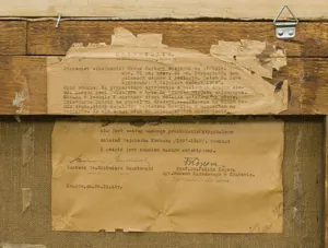 Na odwrocie (na krośnie i płótnie) naklejona karta z orzeczeniem prof. Feliksa Kopery i dra Kazimierza Buczkowskiego potwierdzających autorstwo Kossaka (Kraków, 26. IX 1943).
