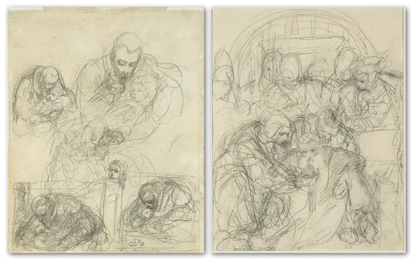 Umieszczone na jednej karcie szkice, to różne warianty kompozycji i szczegółów zamierzonego obrazu przedstawiającego Jana Kochanowskiego pochylonego nad zmarłą córeczką Urszulką. Dwa z nich - u dołu karty - ujęte w ramki - bliskie są kompozycji finalnej, obrazu namalowanego w roku 1862 (olej na płótnie, 98 x 122 cm). Obraz ten zaginął, a jego losy nie są znane; ostatnia o nim wiadomość pochodzi z roku 1893. Wiadomo, że był wówczas własnością dra Lewandowskiego w Paryżu. Natomiast w zbiorach prywatnych zachował się niewielki szkic akwarelowy tej kompozycji.