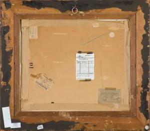 Nalepki (druk, atrament, ołówek): - 1. SALON DZIEŁ SZTUKI | KAZIMIERZA WOJCIECHOWSKIEGO | KRAKÓW, ul. Św. JANA L. 3 TELEFON Nr 2 | DATA PRZYJĘCIA 1931. | Autor Tadeusz (sic !) Styka | Tytuł „Piramida w Gizeh z osiołkiem“ | Rodzaj olej Rozmiar 55 x 46 cm | Nr 6317.; - 2. Miejska Galeria Sztuki w Łodzi | Autor Adam Styka | Rodzaj pracy olejny | Nazwa „Piramida Gizeh | Egipcjanka mała z osiołkiem“ | No katalogu 209 | Data przyjęcia 16/VI- 30 r. | 3.500; - 3. ADAM STYKA | 39. Piramides de Gizeh | (Piramidy w Gizeh); - 4. mała różowa z numerem (druk): 2933.