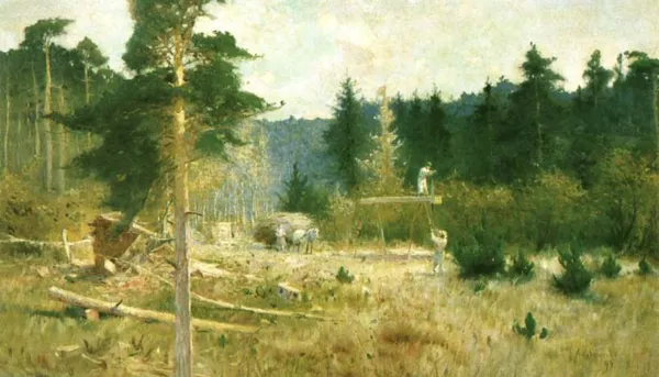 Monumentalna, namalowana w pracowni, jedna z licznych kompozycji z motywem leśnej poręby. W obrazie odnajdujemy wpływy impresjonizmu przefiltrowanego przez zdobycze środowiska monachijskiego. Sceny rodzajowe przedstawiające zajęcia codzienne wieśniaków z Polesia, ziemi opoczyńskiej i łowickiej ("Zwózka kory na Polesiu", "Wianie ziarna", "Przesiewanie", "Przy kolowrotku", "Rybacy") w interpretacji Kędzierskiego pozostają w z...