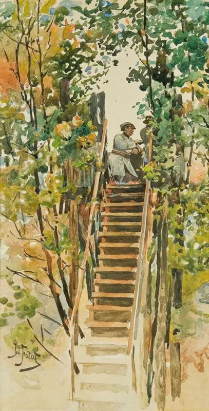 Na górnej listwie ramy nalepka (druk, atrament) o treści: ZACHĘTA SZTUK PIĘKNYCH w WARSZAWIE | Autor Juljan (!) Fałat | Rodzaj akwarela (na stanowisku) | Data 5. lipiec 1929 r.