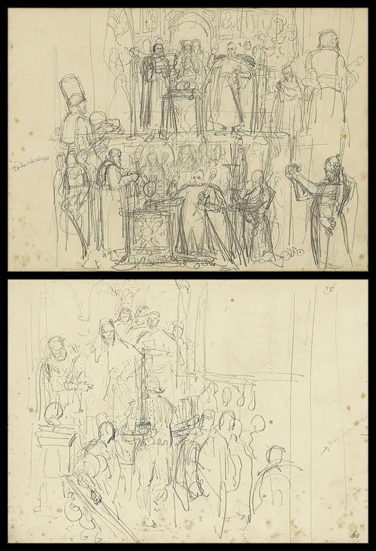 Dwa szkice, umieszczone - jeden nad drugim - po tej stronie karty, to różne warianty rozwiązania kompozycji przedstawiającej scenę ugody zawartej w Perejasławiu...