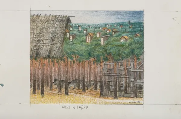sygn oł. w kadrze rysunku: YERKA 07, pod kadrem śr.: Wilki w Łążku
