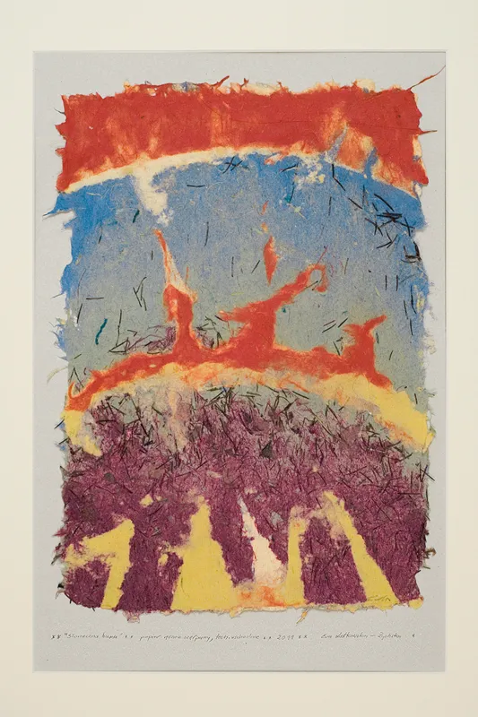 51 x 34 cm (w świetle passe-partout), sygn. oł. na podkładzie od l.: **”Słoneczna burza” ** papier ręcznie czerpany, tech. wschodnie** 2011** Ewa Latkowska- Żychska *