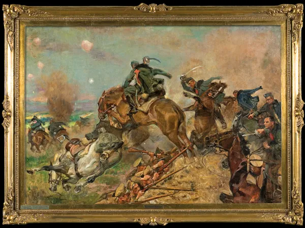 Obraz przedstawia szarżę ułanów 2. szwadronu II Brygady Legionów Polskich, którzy - prowadzeni przez rotmistrza Zbigniewa Dunin-Wąsowicza - 13 czerwca 1915 pod Rokitną zaatakowali pozycje rosyjskie i w ciągu 15 minut przedarli się przez trzy linie nieprzyjacielskie. Tę - nazywaną drugą Somosierrą - bohaterską szarżę polskich ułanów Wojciech Kossak malował już w roku 1916; powstały wówczas dwa obrazy przedstawiające atakujących ułanów w ujęciu ...