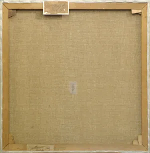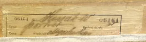 1. na górnej listwie nalepka o treści: No ... 1928 | AUTOR Kossak Wojciech | TYTUŁ DZIEŁA Portret | RODZAJ DZIEŁA ol. | Cena... Podpis .. |||| Z boku wzdłuż lewej krawędzi tejże nalepki tekst: Zaniedbując umieszczenie niniejszej | karty na dziele zrzeka się tem samem | prawa do reklamacji za ewentualne | pomyłki |||| wzdłuż prawej krawędzi: Kartę niniejszą należy przykleić na | odwrotnej stronie dzieła.
