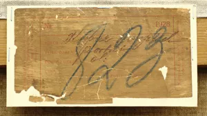 1. na górnej listwie nalepka o treści: No ... 1928 | AUTOR Kossak Wojciech | TYTUŁ DZIEŁA Portret | RODZAJ DZIEŁA ol. | Cena... Podpis .. |||| Z boku wzdłuż lewej krawędzi tejże nalepki tekst: Zaniedbując umieszczenie niniejszej | karty na dziele zrzeka się tem samem | prawa do reklama...