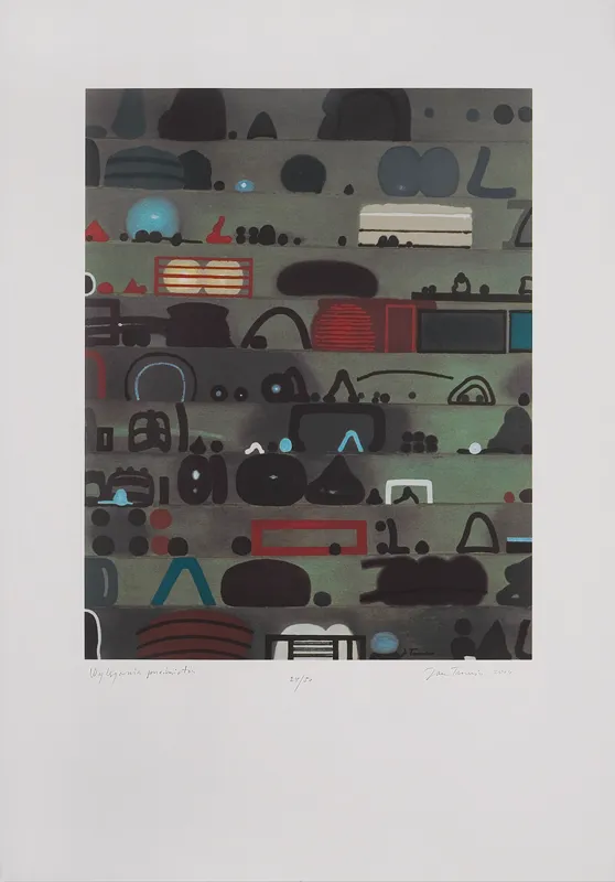 sygn. z płyty p.d.: J.Tarasin, sygn. oł. pod ryc. l.: Wylęgarnia przedmiotów, śr.: 24/50, p.: Jan Tarasin 2004, na odwr. stempel: Druk Centrum Sitodruku Akademia Sztuk Pięknych w Łodzi 2004