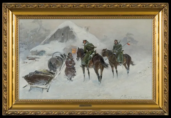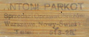 Na krośnie i dwa ramie stemple: ANTONI PARKOT | Sprzedaż i oprawa obrazów | Warszawa, Nowy Świat 17 | Telefon 513-28.