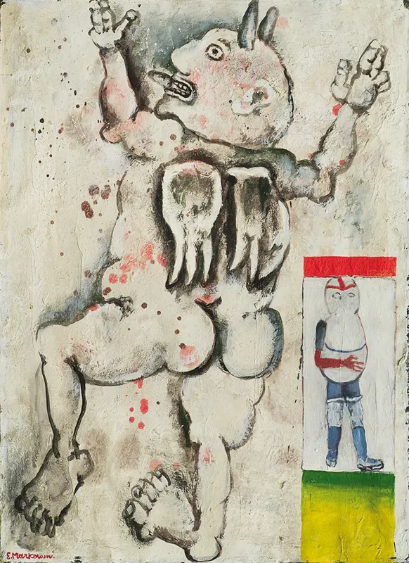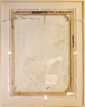 na odwrocie na górnej listwie krosna czarną farbą: „DIAVOLETTO 1970, E. MARKOWSKI; na lewej listwie: 80 x 60, na odwr. na płótnie l.g.: Techn. mixta