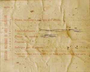 2 nalepki: Rassegna Nazionale di Arti Figurative Roma 1947[!] wypełniona ręcznie (nieczytelnie), druga zniszczona, nieczytelna