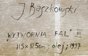 Na odwrocie na płótnie napis autorski: J. Baszkowski | „WYTWÓRNIA FAL“ III | 115 x 125 cm; olej; 1997