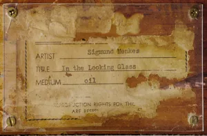 Na ramie nalepka (druk wypełniony na maszynie) o treści: ARTIST Sigmund Menkes | TITLE In the Looking Glass | MEDIUM oil | REPRODUCTION RIGHTS FOR THI[...] | ARE RESERVED ST