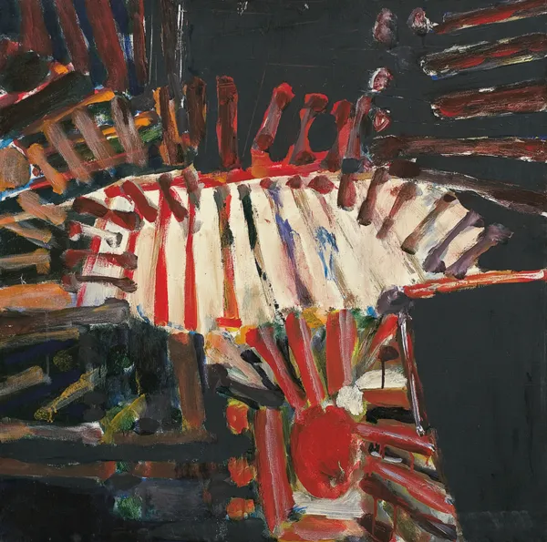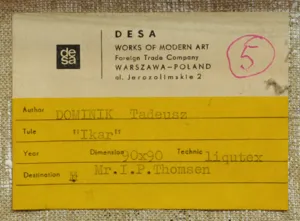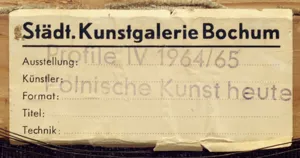 Na płótnie nalepka informacyjna Desy; na krośnie nalepka Stadt. Kunstgalerie Bochum z wystawy: Polnische Kunst heute Profile IV 1964/65