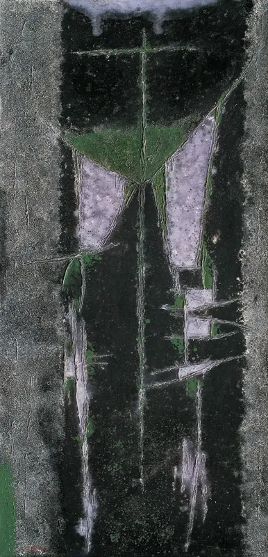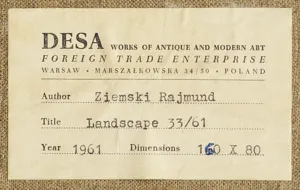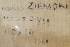Na odwrocie na płótnie napis autorski: RAJMUND ZIEMSKI | PEJZAŻ 33/61 | 160 x 80 | 1961