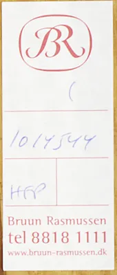 Na płótnie nalepka informacyjna DESY z nazwiskiem artysty i tytułem obrazu; na krośnie nalepka domu aukcyjnego Bruun Rasmussen z Kopenhagi.