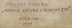 Na odwrocie na płótnie napis autorski: JULIUSZ JONIAK | „MARTWA NATURA Z BUKIETEM“ | 100 x 100 | 1991